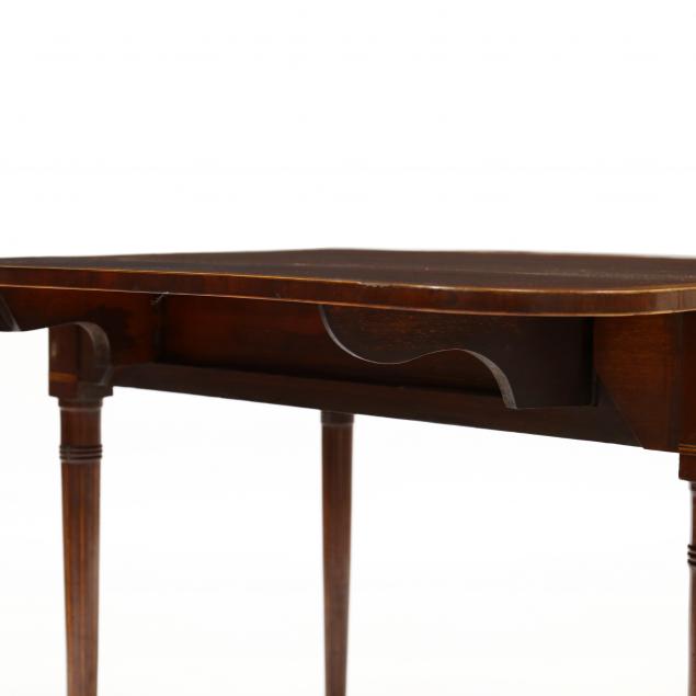 Early 19th century, mahogany, mahogany veneer with light and dark wood inlays, oak secondary, "D-end" drop leaves with double butterfly support, single drawer stamped "FROM W. WILLIAMSON & SON GUILFORD", verso with faux drawer, raised on turned tapered and line inlaid legs, on casters.