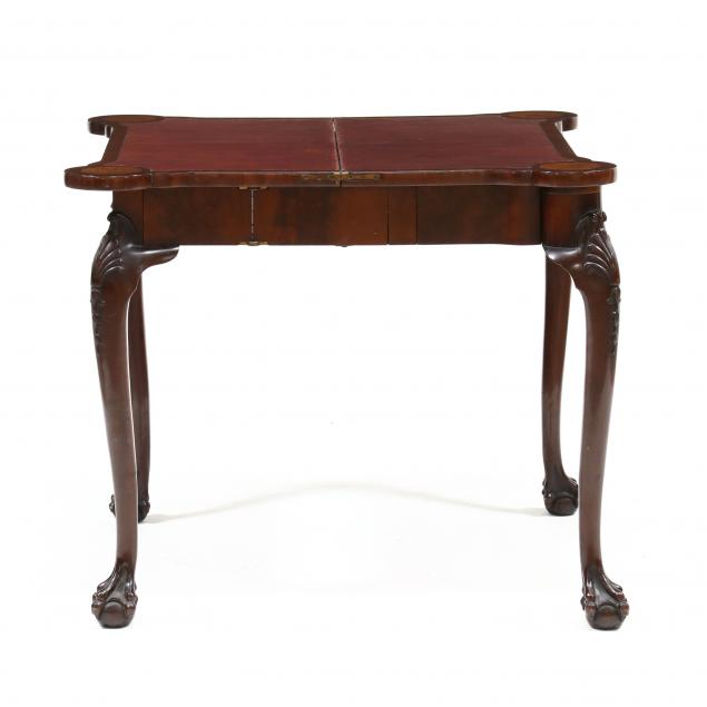 Mid to late 20th century, labeled "The Hayden Company", mahogany veneer, rectangular top with porringer corners having conforming banded inlays, lid opens to reveal a red leather playing surface with concertina action support, the sides with pull out small drawers, cabriole legs with shell and scroll carved knees on ball and claw feet.