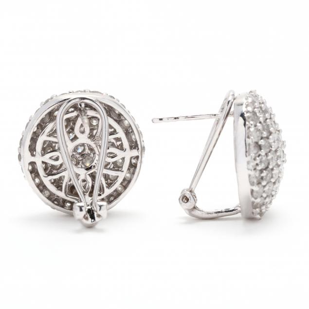 In a circular design and set with a cluster of full cut round diamonds weighing approximately 2.2 total carats (H-I color, I1-I3 clarity), completed with posts and omega clip backs, stamped 14K.