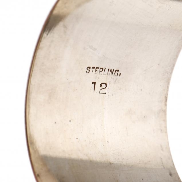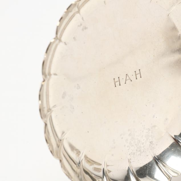 The first a Tiffany & Co. dish, 1947-1956 period hallmark, a reproduction of a circa 1717 Irish silver dish, pattern number 20742, period monogram "HAH" (4 1/2 in. diameter) (light scratching); the second an Art Deco period cake plate with cutwork rim, mark of J. E. Blake Co., period monogram (8 in. diameter) (minor dent to rim); the third an unusual footed dresser jar with cover, featuring foliate and floral engraving against an engine turned ground, circa 1900, rubbed manufacturer's mark, period "JLH" monogram to cover (some denting to cover); a napkin ring with floral engraving and period monogram "EFM," unknown manufacturer, model number 12 (good estate condition); and two child's cups, the larger with mark of Watson Co. (both with denting).