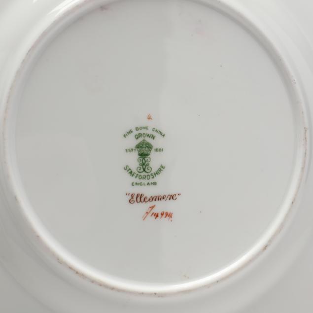 Made in England, decorated with gryphons and scrolling foliage on a turquoise border, gilt rim, to include: (12) dinner plates (10 5/8 in.), (11) salad plates, (11) shallow soup bowls (1 1/2 x 8 1/4 in.), (12) berry bowls, (13) bread & butter (6 1/4 in.), (12) cups with (14) saucers, an oval serving dish, a gravy boat with under plate, a covered entree server (DOA 6 x 9 1/2 in.), a helmet form creamer and a covered sugar.