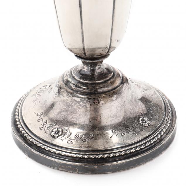 Mark of Watson, pattern number R11, tapering floral form with everted petal rim, body decorated in bright cut and chased floral swag designs, over a spreading round weighted base. Without monogram.