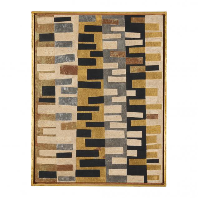 Black oil with gold and palladium leaf and lacquer, 1959, initialed by the artist at lower right, inscribed to verso, retaining typed gallery label to verso, presented in a period floater frame with gilt edge.