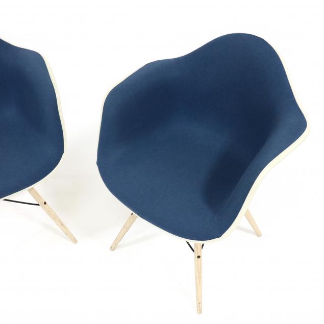 Herman Miller, 2017 production, white fiberglass shell with blue and green fabric upholstery, splayed oak legs, labeled.