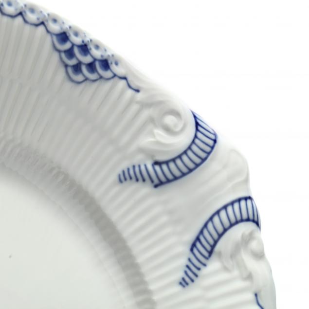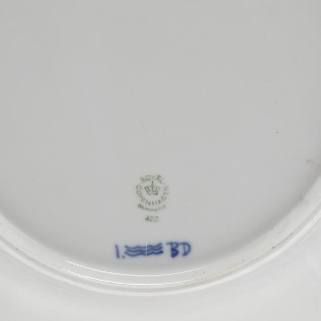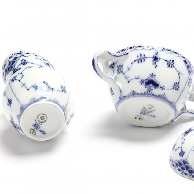 Made in Denmark, delicate blue flowers and vines encircled by a non-pierced rim, to include: (5) dinner plates #571, (2) cake dishes #761 (8 3/4 in.), (6) salad plates #573 (7 1/4 in.), (3) dessert plates #575 (6 1/8 in.), (2) large cups #1130 with (2)saucers #525, (9) tea cups #1035, #719 #756 with (7) saucers #719, #756 #1035; cereal bowl #624. Accessory pieces include a teapot, a coffee pot, a covered sugar, a cream jug, (2) butter pats, a round tray (12 x 11 in.) #422, total accessory items (7).