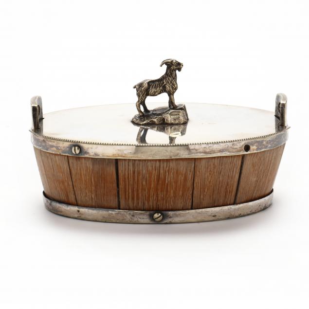 Second half 19th century, mark of Atkin Bros., pattern number 3319, oval form wooden body with silver plate strap fittings and double handles, lid with naturalistic finial depiciting a goat standing on rocky precipice, interior with removable period Copeland porcelain insert (likely original), without monogram.