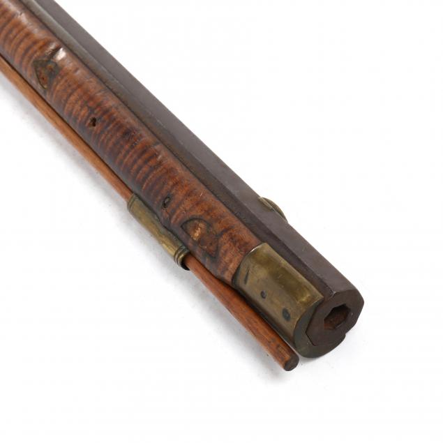 Circa 1850s, American percussion rifle, full length tiger maple wood stock, 37.75 in octagonal barrel, 44 cal., double riggers with brass trigger guard, brass patchbox.