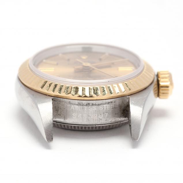 Circa 1993, model no. 67193, serial no. S483207, automatic, the stainless steel case with fluted gold bezel, the signed champagne dial with baton hour markers and hands, with center seconds hand sweep, completed with a two tone Oyster bracelet band with signed deployment clasp marked T12 / 62523 D 18, case back with engraving dated July 7 2002.