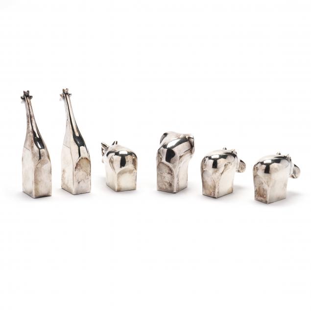 Circa 1970s, forms include a pair of giraffes, a pair of hippopotamuses, an elephant and rhino, all marked to underside.