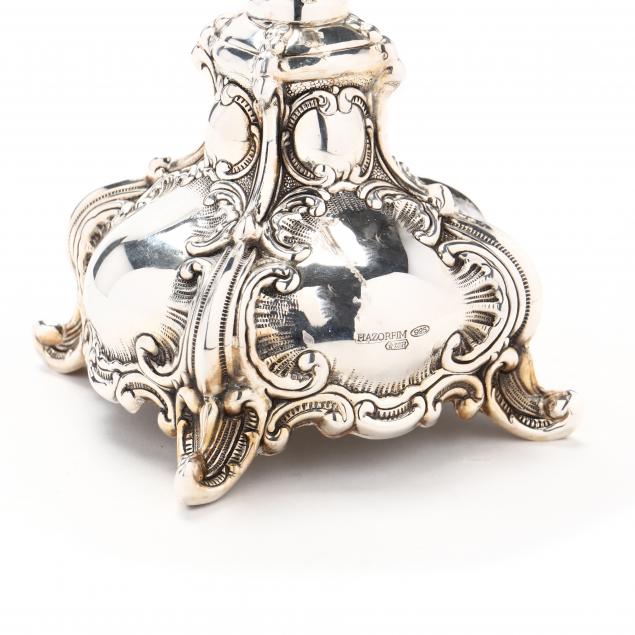 Circa 2000, marked "HAZORFIM 925" with lozenge mark, eight light "man" branch design with floral motif, central shamash, atop an ornate Ben Yehuda weighted base, without monogram.
