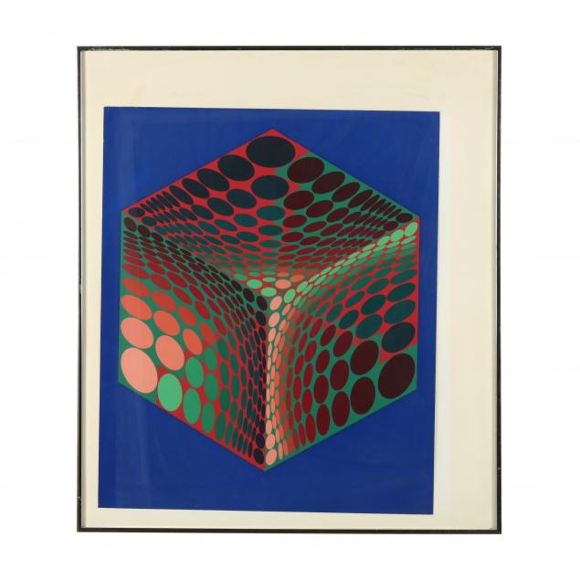 Private Collection, Brooklyn, New York Vasarely is known as the grandfather and leader of the Op-art movement. He was born in Pécs, Hungary in 1906, and after studying under the artist Sánor Bortnyik at the Mühely Academy he moved to Paris to work in graphic arts, where he worked the remainder of his life. After World War II, Vasarely had his first important Paris exhibition at the Galerie Denise René and decided to leave graphic arts to focus on developing his own signature style in painting which utilized the principles of optical illusion and abstract shapes and bold colors. The 1965 exhibition The Responsive Eye at the Museum of Modern Art, New York consecrated his international recognition as the leader of the Op-art movement. Vasarely received numerous prestigious awards throughout the international art world scene, and influenced many later artists. His paintings are held in the most influential modern art museums across the world.