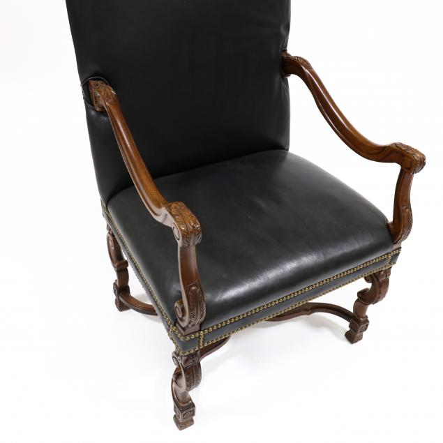 Labeled Whittemore-Sherril, charcoal leather with brass nail head trim, relief carved arms and legs with shaped stretcher base.