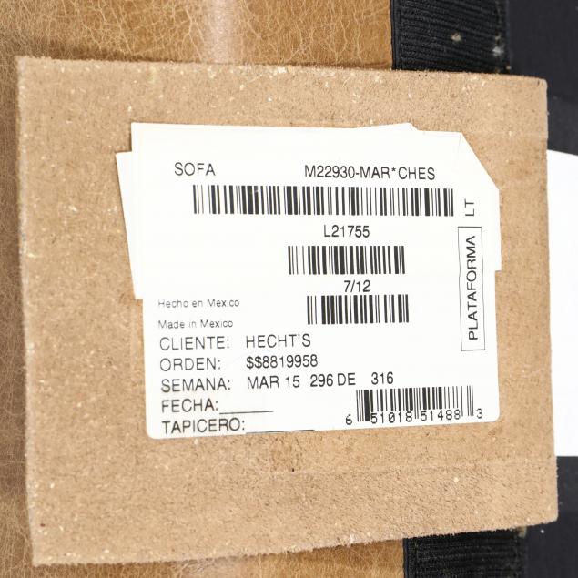 Labeled Leather Mart, tan leather upholstery with brass nail head trim, three loose seat cushions with velcro attachment, turned wood feet.