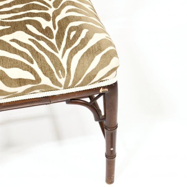 Post 1970, including one armchair and four side chairs, cane panel back, animal print upholstered seats on tapered legs with stretcher base, unmarked.