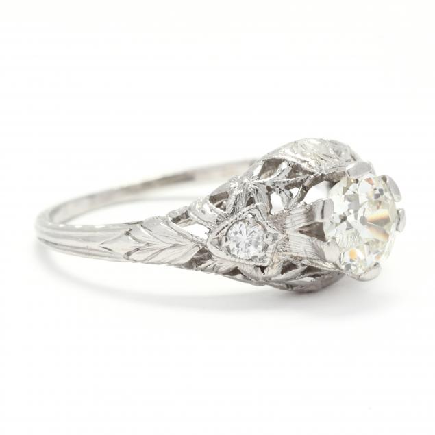 Centered on an old European cut diamond (5.7 - 5.7 x 3.25 mm) weighing approximately .61 carat (J color, I2 clarity), the floral filigree setting with full cut round diamond accents, stamped 10% Irid. and with maker's mark.