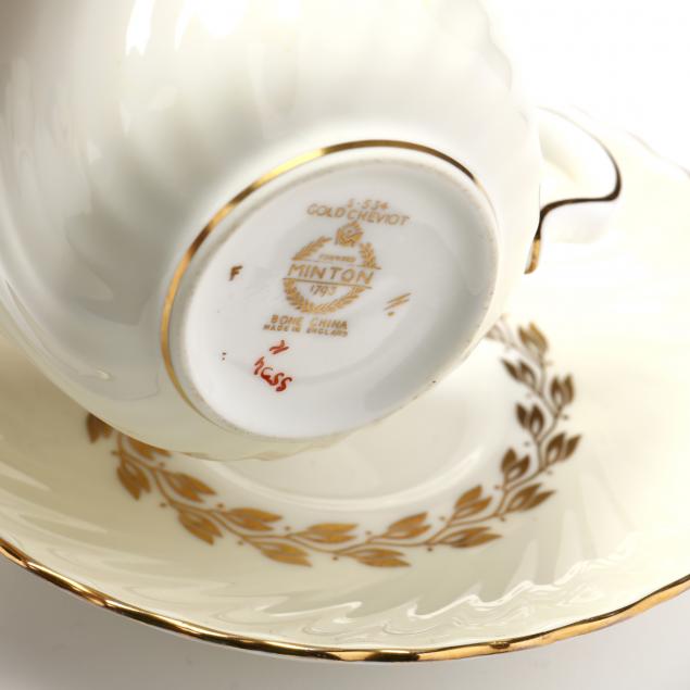 England, (94) pieces, inner gilt laurel motif with scalloped rim and gilt border, to include (9) dinner plates (10 5/8 in.); (16) luncheon plates (7 3/4 in.); (12) dessert plates (7 in.); (12) footed cream soup bowls (2 1/4 x 4 1/2 in.) with eight saucers (6 1/4 in.); (15) teacups (2 1/4 in.) with (14) saucers (5 5/8 in.); (4) demitasse cups with (4) saucers. All marked to underside.
