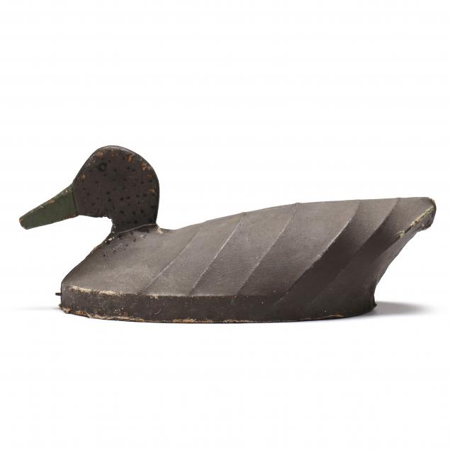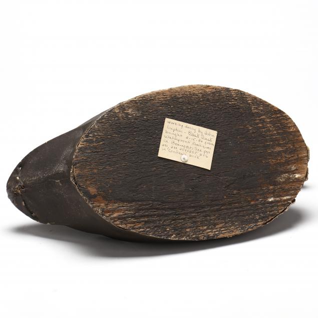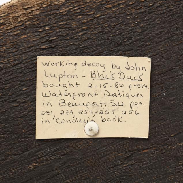 John Lupton began making canvas decoys with Harry Hamilton, his neighbor and life-long friend. He used thick juniper boards and the juniper heads were finished with a rasp. Many of the ribs for the canvas covered decoys were made with copper wire from old telegraph lines. A rig mate to this decoy is published on pages 124-125 of