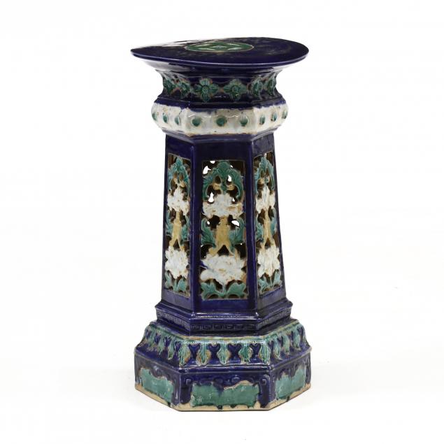 First half 20th century, decorated in sancai glaze of blue, green, and white, the panel reticulated sides with with auspicious bat and lotus flower motifs, the top with a reticulated coin symbol.