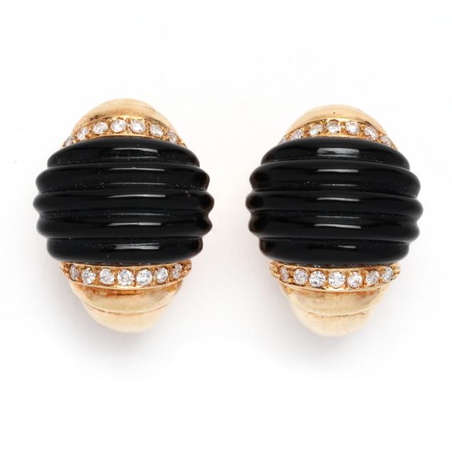 Set to the center with ribbed carved onyx, set with full cut round diamonds weighing approximately .42 total carat (H-I color, SI2-I1 clarity), completed with posts and omega clip backs, stamped 750 and with maker's mark T.