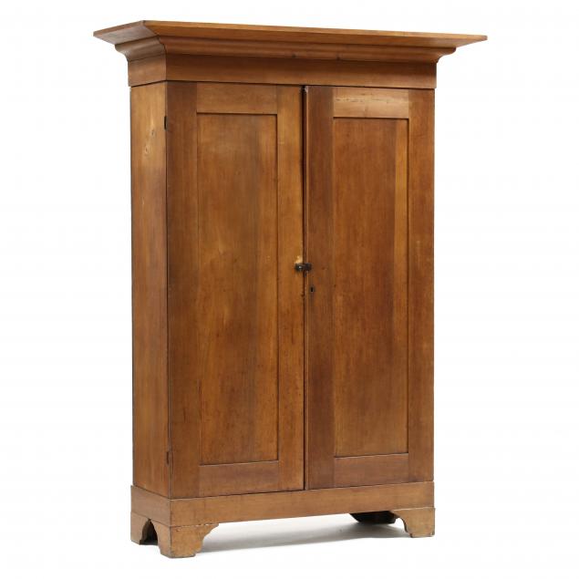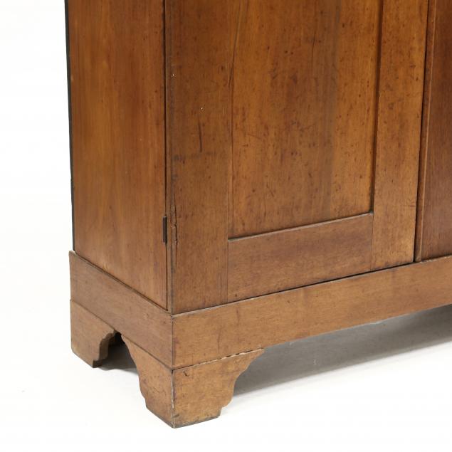 Circa 1820-40, poplar secondary, multi-part form, distinctive ogee and flared cornice above a plain frieze, the case with two large hinged paneled cabinet doors, the interior shelved on the right side with single drawer, open on the left side, shaped bracket foot base.