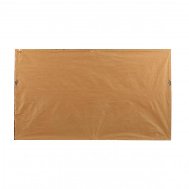 After a mural in the tomb of Prince Zhang from the Tang dynasty, five men on horseback are depicted playing polo, inscription to upper left together with two red artist seals, professionally framed under glass.