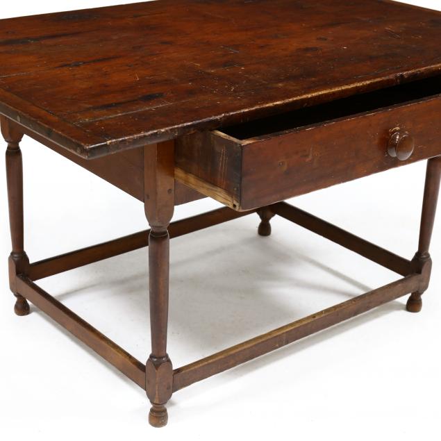 19th century, white pine, large rectangular single board top with bread board ends, deep overhang, single flush drawer, turned and tapered legs, box stretcher with turned feet.