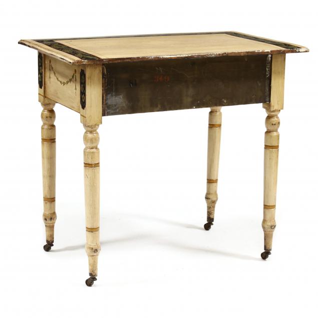 Late 19th century, pine with polychrome paint decoration, rectangular top with molded edge, single flush drawer, turned legs on casters.