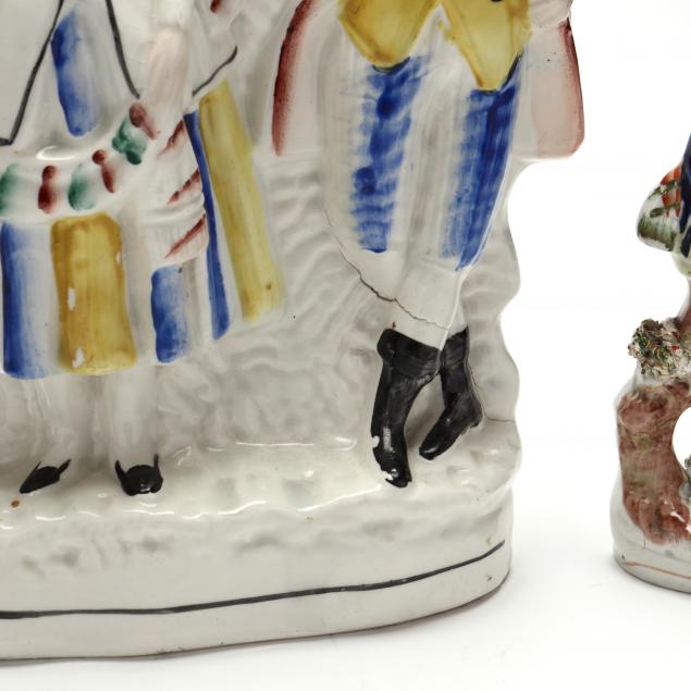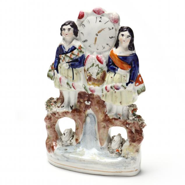 Circa 1860s-70s, two girls standing on a bridge, faux clock (7 1/2 in.) (loss to applied grasses), a seated whippet (broken front leg), a large figurine of a couple (firing crack through his leg) (12 in.).