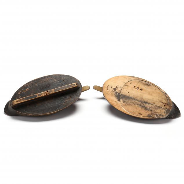 From the Collection of Tilford Wade These decoys carry important brands. Edward Collings Knight, Jr. designed and built the famous Whalehead Club in Corolla. Tilford Wade was a guide at the Swan Island Club. They are both hollow carved pine.