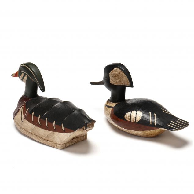 Knotts Island, North Carolina, circa 2000, wood duck is canvas over wire construction, merganser is carved and painted wood, glass eyes, WM incised on the bottom of both decoys.