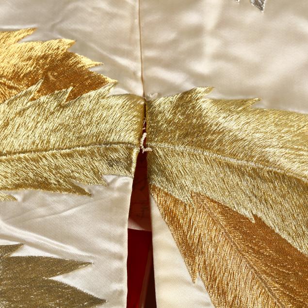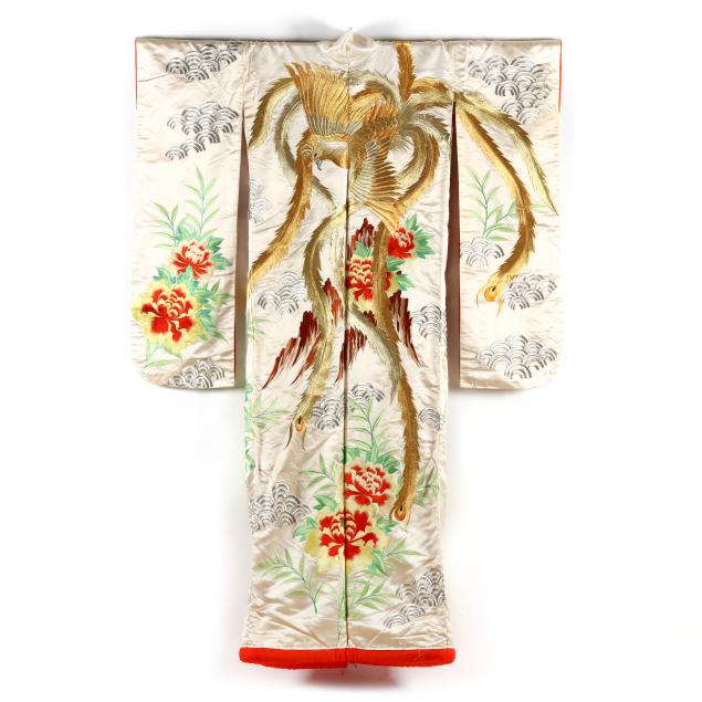 20th century, includes two uchikake, the first with ivory silk ground embroidered with silver metallic arches, large floral blossoms in reddish orange and pale yellow, green leaves, a circular temple pagoda and on the back a large phoenix with its tail feathers extending onto the front of the kimono, the second with ivory silk ground embroidered in polychrome silk and metallic threads with turquoise birds and peach colored peacocks amidst pink leaves and aqua blue pine branches, both kimonos are lined in red, these robes were meant to be worn as an outer coat during a traditional Japanese wedding ceremony.