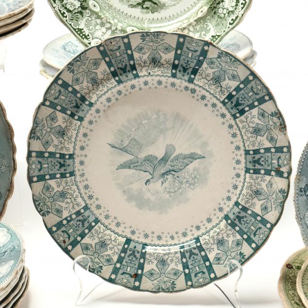 England, 1830s-50s, to include: (12) dinner plates (approx. 10 in.) (3 with chips), (9) luncheon or dessert plates (several hairlines at rim, rim nicks, edge wear), a bowl "Canova" (2 1//4 x 9 3/4 in.), (2) small trays, an oval tray "Belzoni" (9 1/2 in.)