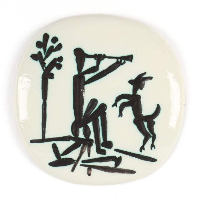 Terre de faïence plaque, partially glazed and painted, 1956, edition of 450, with "Madoura Plein Feu" and "Empreinte Originale de Picasso" impressed stamps to verso. Alain Ramié 382.