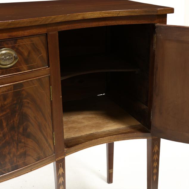 Early 19th century, mahogany veneer, with white pine secondary, rectangular top with bold serpentine front and lightwood line inlay at front edge, upper central conforming cock beaded drawer above two conforming hinged cabinet doors, flanked by two hinged concave cabinet doors, all cabinet doors with burl figured veneers, the upper stiles with light and dark wood stylized reeded inlay, light and dark wood stylized inlay at base of case, raised on six square tapered legs.