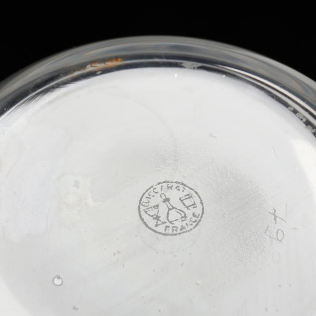 France, early to mid 20th century, including a pair of faceted elongated neck bottles with air trap stoppers; and a Remy Martin decanter with applied fleur de lis and crempt edges, signed.