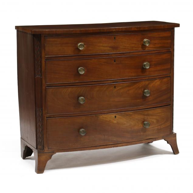 Circa 1800, mahogany veneer, pine secondary, top with vertically veneered edge, four graduated cock beaded drawers flanked by canted corners with relief carved acanthus leaf and reeded panels, French bracket front feet, rear straight shaped bracket feet.