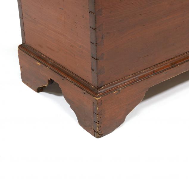 Attributed to Piedmont, North Carolina, early 19th century, yellow pine dovetailed case, rectangular lid with bread board ends and applied molding to underside, interior with till and strap hinges, six board construction, dovetailed shaped bracket foot base.