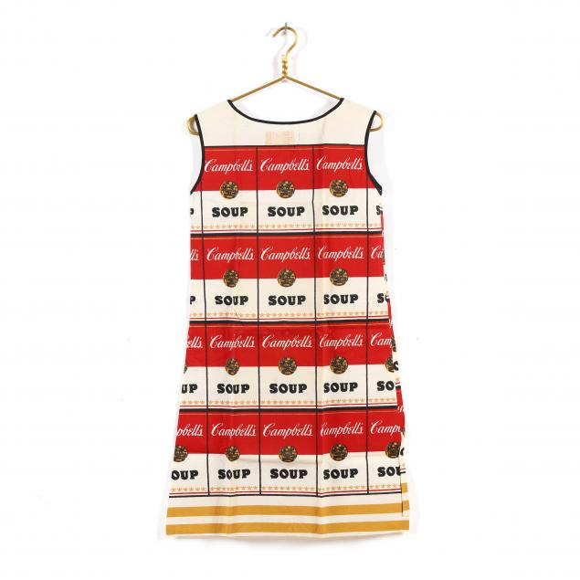 Screenprint in colors on cellulose and cotton dress, late 1960s, with care label on inside of neck, titled, 'The Souper Dress,' from an edition of an unknown size, produced by Campbell's Soups, Camden, New Jersey, also retains additional labels/tags.