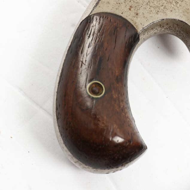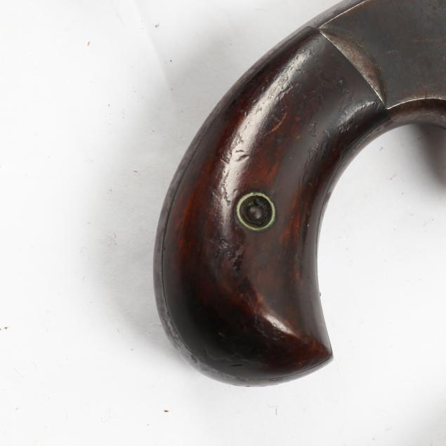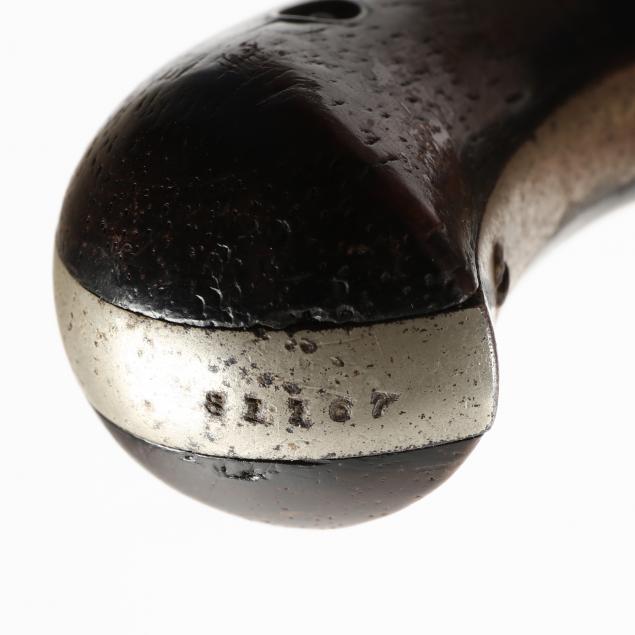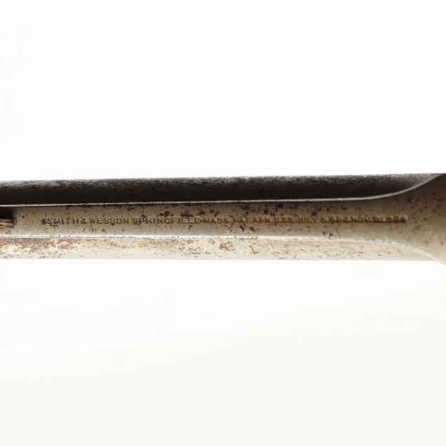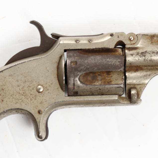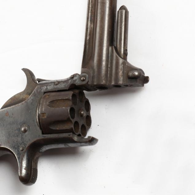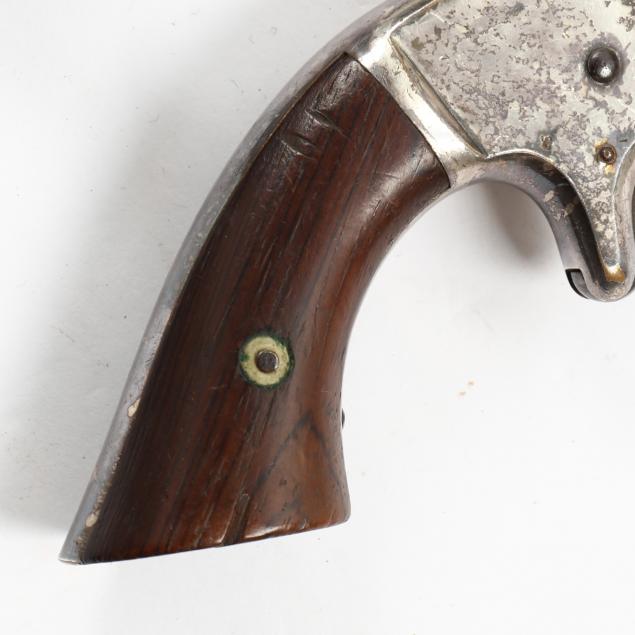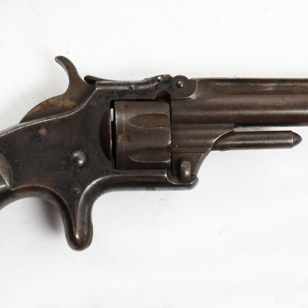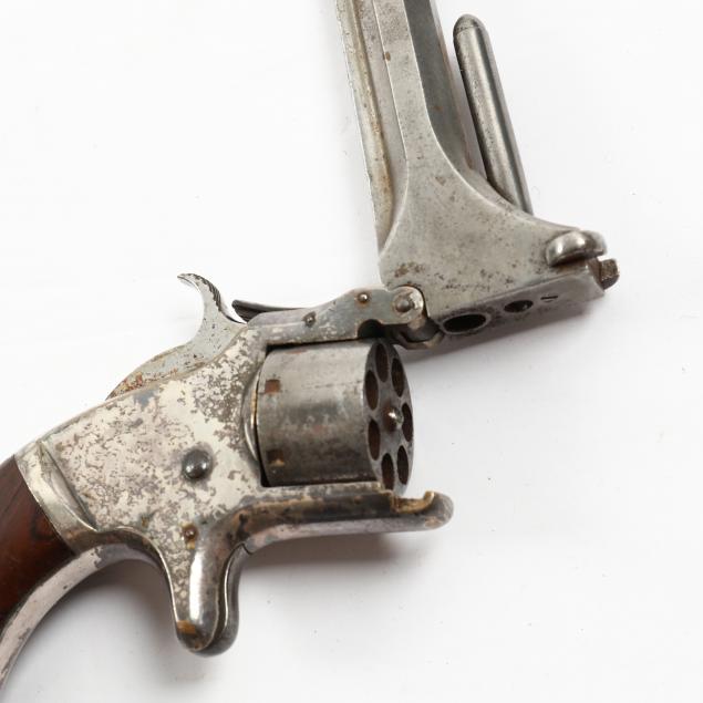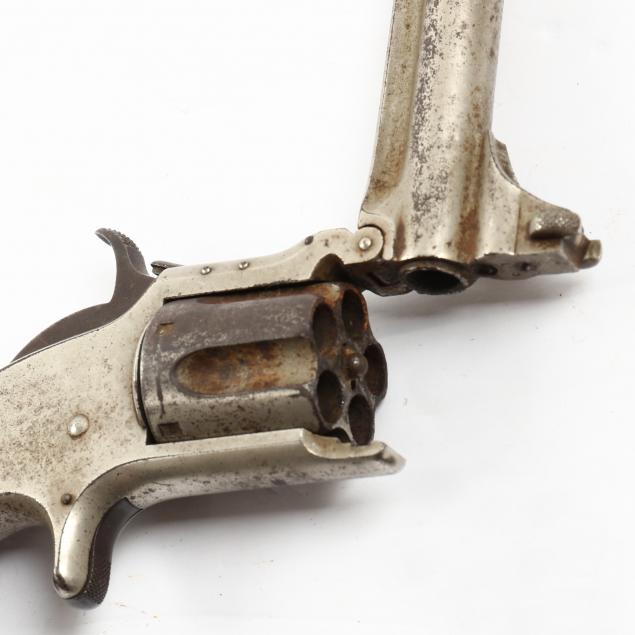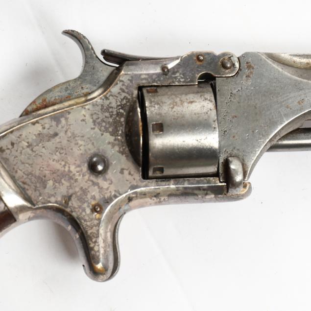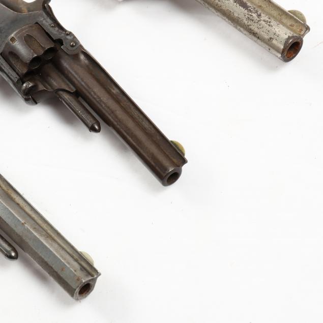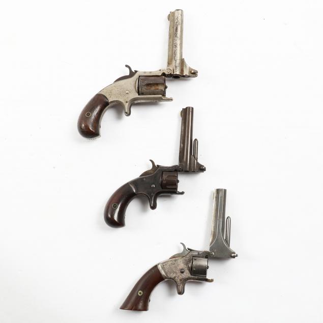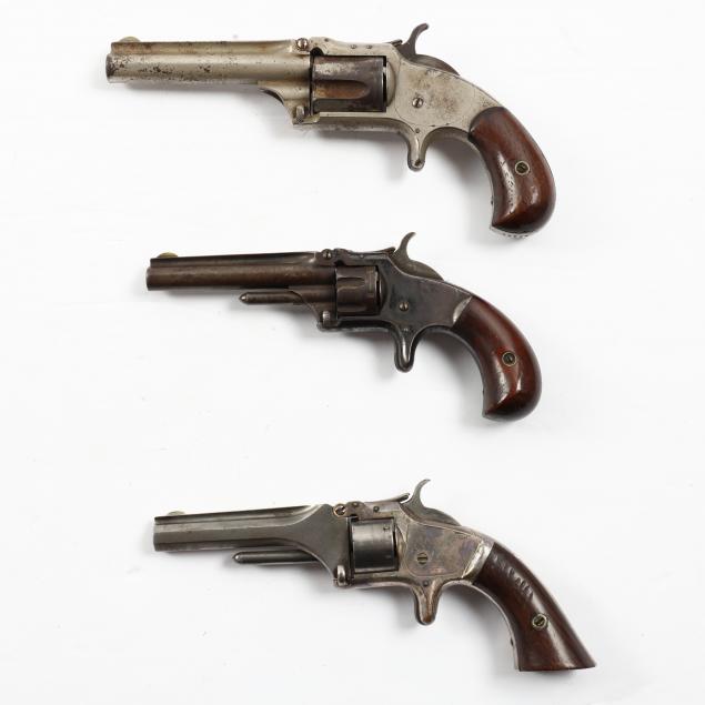 To include: S&W Model No. 1 Second Issue, 1860s, serial number 59515 (somewhat obscured, but Civil War era), .22 caliber 7-shot cylinder, walnut grip, nickel over brass frame (working action, lower catch of barrel somewhat loose); S&W Model No. 1 Third Issue, late 1860s -1881, serial number 41240, .22 caliber 7-shot cylinder, walnut bird's head grip, nickel-plated frame (working action, good condition); S&W Model 1-1/2 Second Issue, 1868-1875, serial number 49118, .32 caliber, 5-shot cylinder, nickel-plate throughout, bird's head grip (working action; some losses to plating; lacks rammer pin, else good condition).