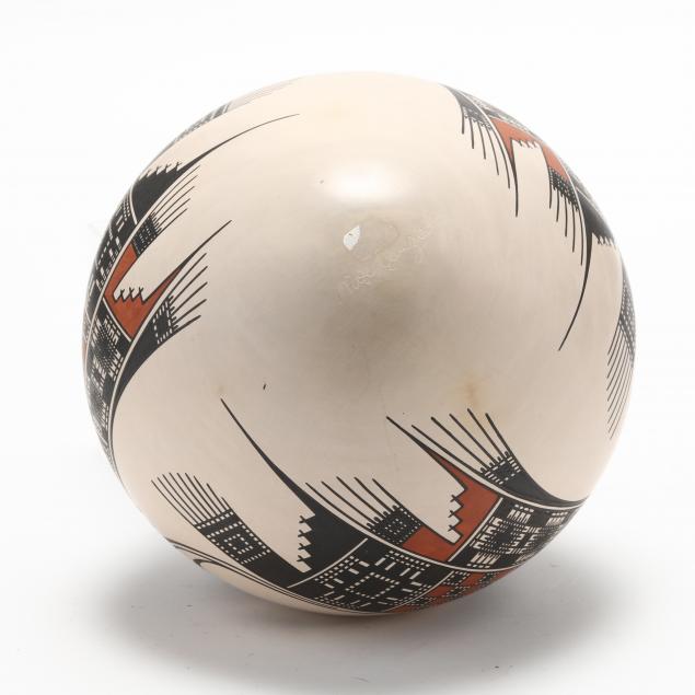 The eldest son of artist Juan Quezada, an egg-shape vessel having a thin clay wall with cream field, black and rust accent design, signed on the underside by the artist.