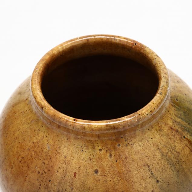 Ovoid vase, earthenware with streaky clear lead glaze, numerous small glaze imperfections throughout, inscribed on the underside, under the glaze, "1921 / J. W. Hilton". The vase appears, despite the signature, to have been turned at Auman Pottery. A find for the collector of the unusual.