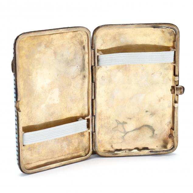 1896-1908, Moscow, assay mark of Ivan Lebedkin, .88 zolotnik, two sets of marks, parcel gilt, rectangular form with rounded corners, each side featuring floral and foliate motifs with geometric flourishes, shaded enamels.