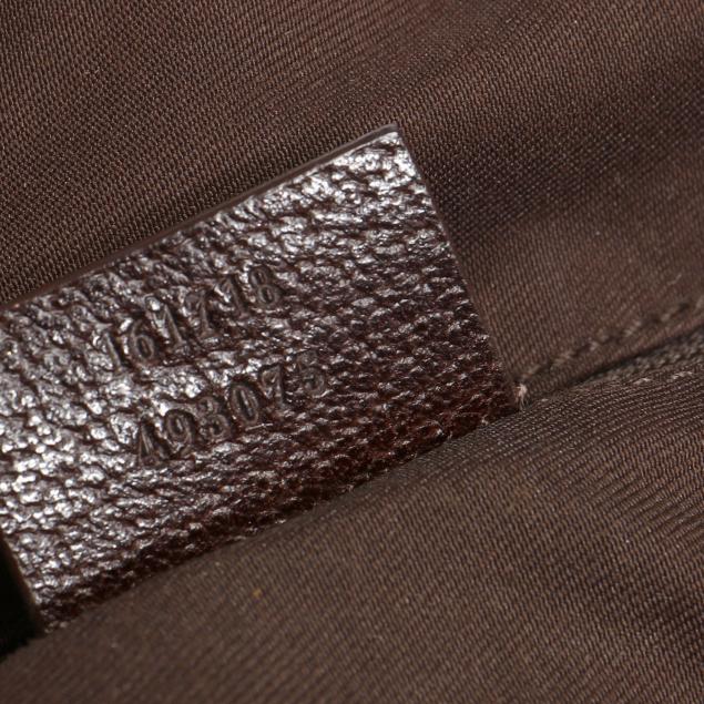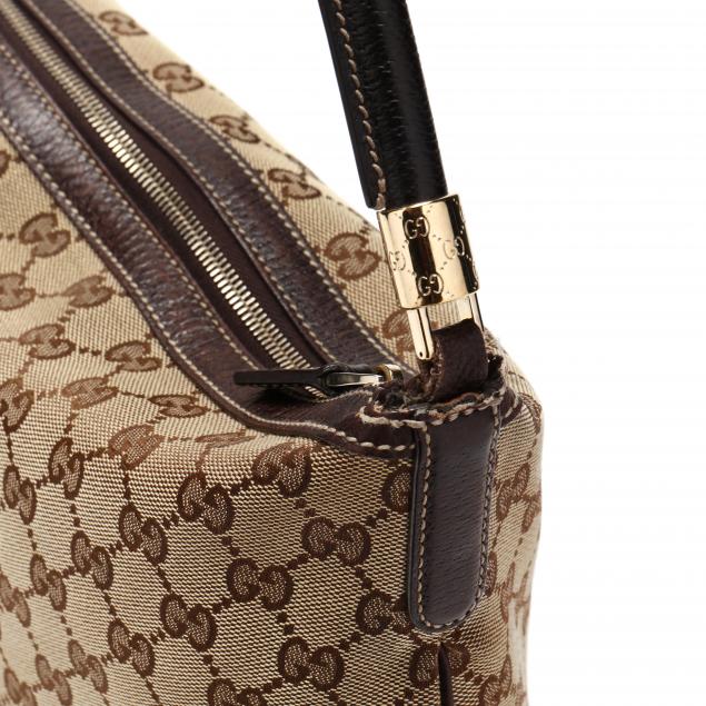Made in Italy, brown GG monogram canvas with dark brown leather and contrast stitch trim, a single round leather handle features GG embossed terminals, the top zipper closure opens to an interior with a patch pocket and an opposite zip pocket.