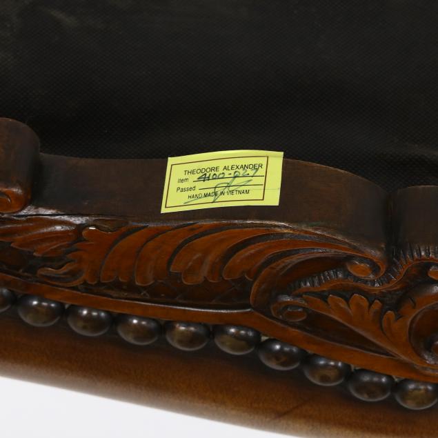 Late 20th century, embossed brown leather upholstery with patinated brass nail head trim, shaped and relief carved arms, carved cabriole legs with whorl feet, labeled.