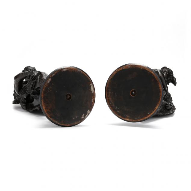 Early 20th century, cast spelter with bronzed tone patina, unsigned, both mounted atop a matching tiered ebonized wood base.