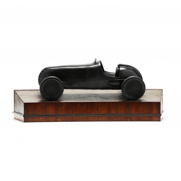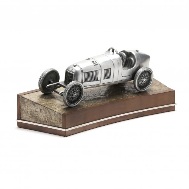 Late 20th century, (3) models cast in brass and one in aluminum, including a Bugatti Royal Coupe and Alfa Romeo Spyder type, mounted onto a polished wood and hardstone base, one retaining company label (9 x 19 x 8 1/4 in.); and two models Art Deco style racers, each mounted atop matching curved roadway form bases (9 x 20 1/4 x 7 1/4 in.).