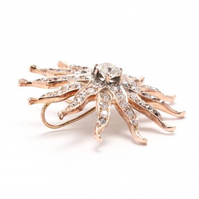 The sunburst centering on an old European cut diamond (6.0-5.89 x 3.41mm) weighing approximately .74 carat (I color, I1 clarity) and its rays bead set with