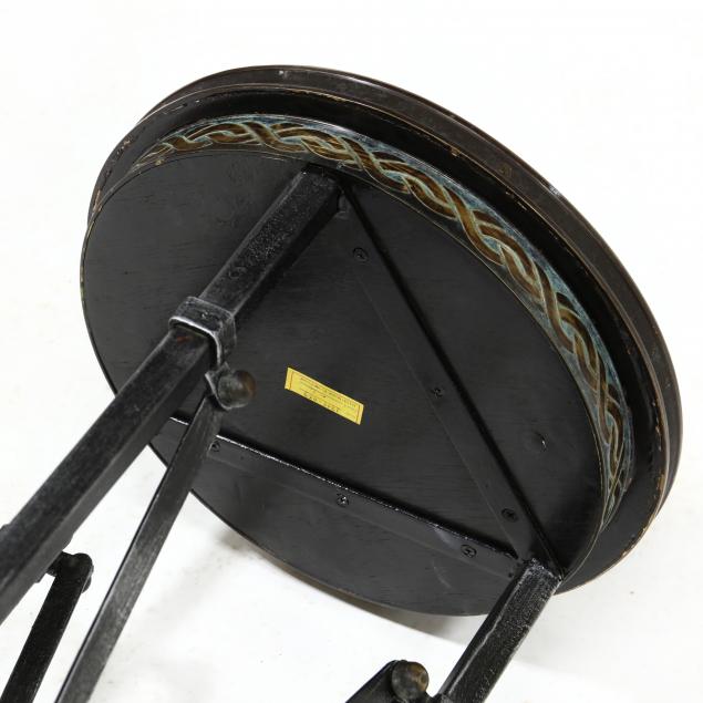 Contemporary, patinated bronze top, painted silver and black tone metal base with cross arm supports, penny feet, label to underside.