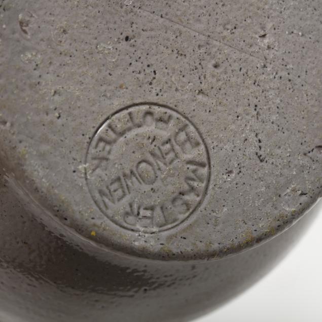 Salt glazed stoneware, the first is a Ben Owen Master Potter with cobalt dip, stamped on the underside (6 3/4 in.) the other two are made at Jugtown with white slip dips, stamped (taller 7 in.).