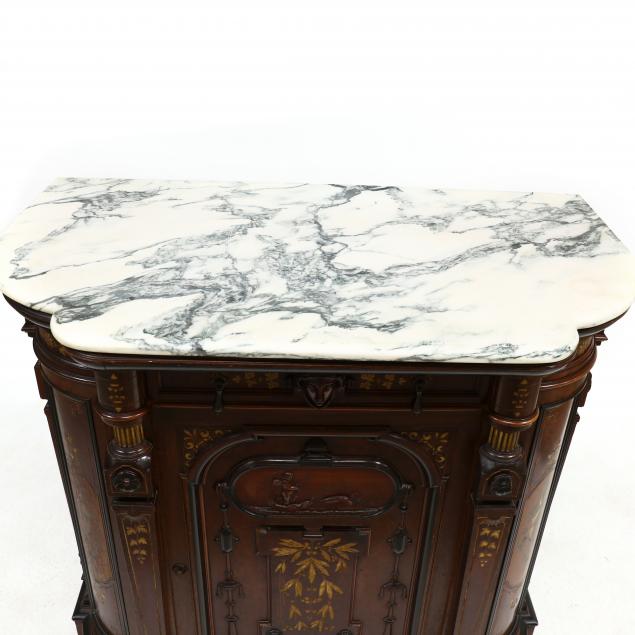 Attributed to New York, circa 1870, cherry, walnut and burl wood veneers, white pine and mixed wood secondary, later custom conforming marble top, original top with banded veneer edge and red linen center panel, the case with upper drawer above a single hinged cabinet door, shelved interior, the cabinet with all over incised decoration with gilt highlight, applied carvings including swan and cupid and painted vignettes with mythological creatures, the molding and trims with ebonized highlights, lower side panels with original molding cut-out to receive base moldings in home, on casters.